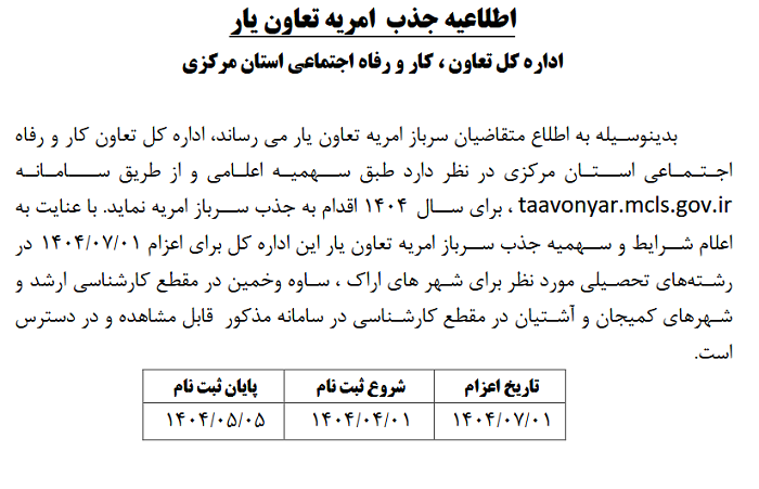 اطلاعیه جذب امریه تعاون یار ۱۱ تیر ۱۴۰۴ | ۱۲:۰۴ کد : ۵۲۷۴۸ اطلاعیه ارسال به دیگران نام شما ایمیل شما ایمیل دریافتکننده ارسال انصراف تعداد بازدید:۱۱۸۶ اطلاعیه جذب امریه تعاون یار
